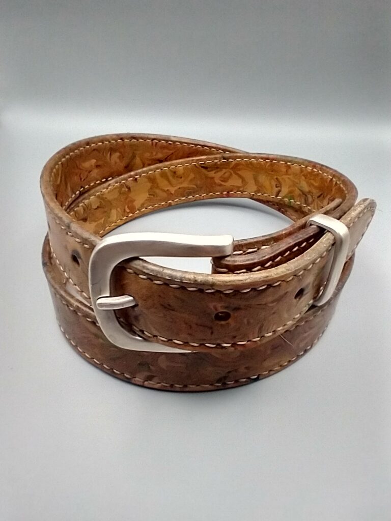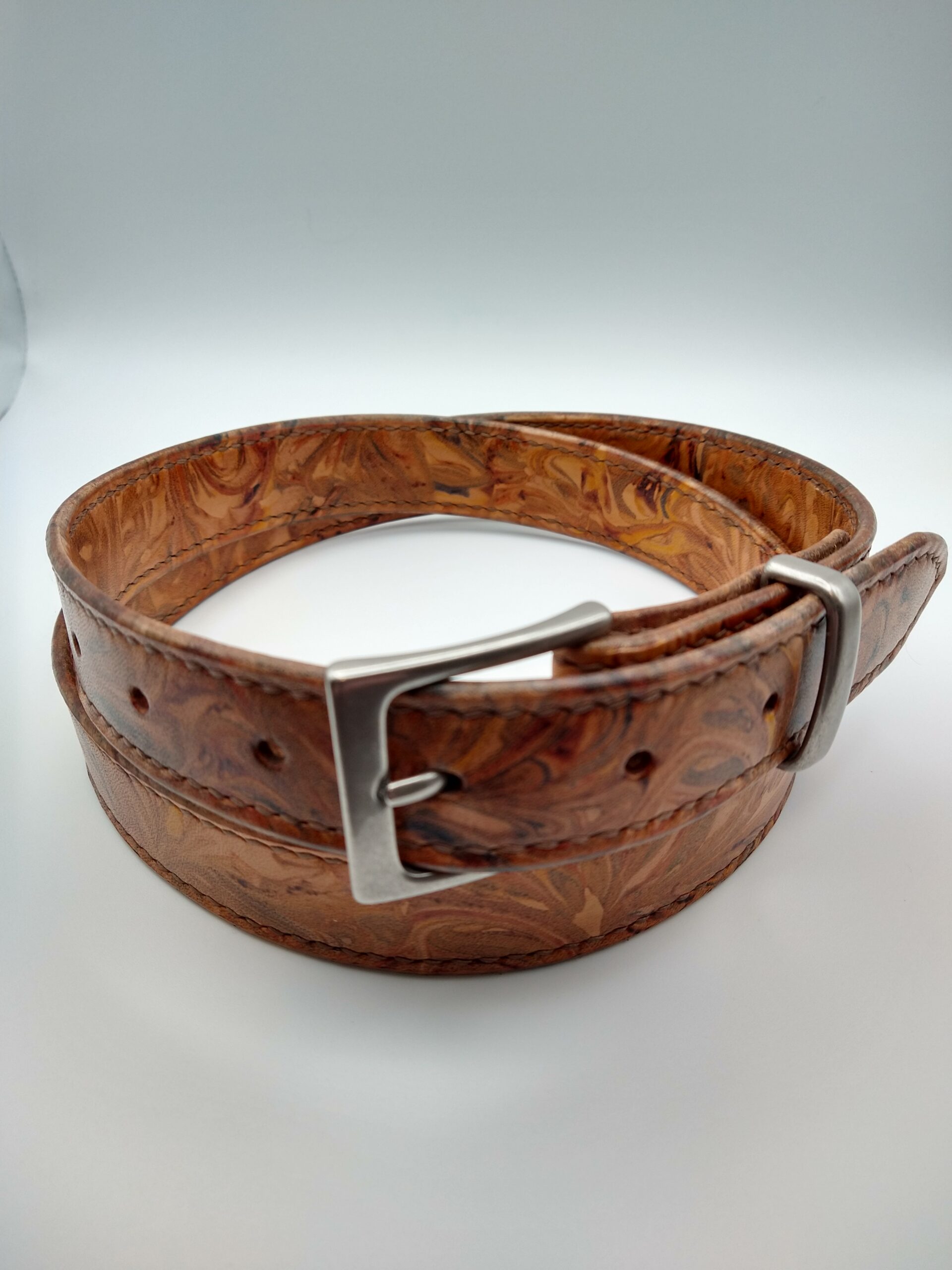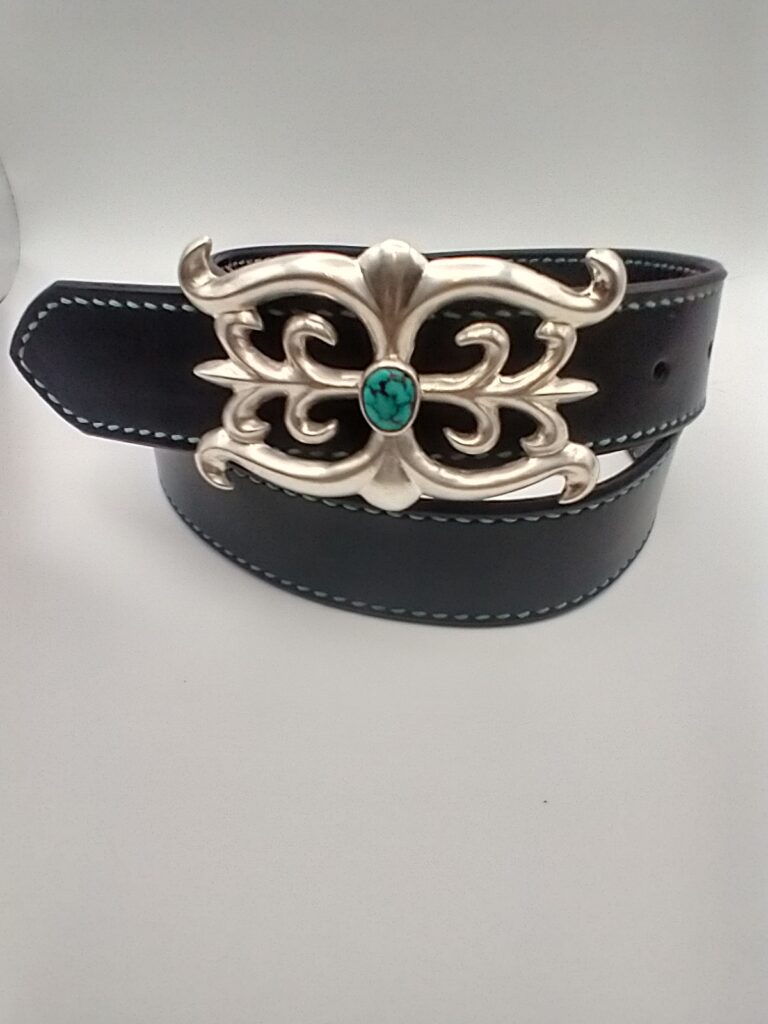 1 1/4″ marbled belt with beige stitching1 1/4″ marbled belt with brown stitching1 1/4″ brown belt with dark brown stitching1 1/4″ black formal belt with black stitching1 1/2″ black belt with turquoise stitching and a custom sterling silver buckle with turquoise inset1 1/4″ marbled belt with sterling silver buckle and keeper created by me.