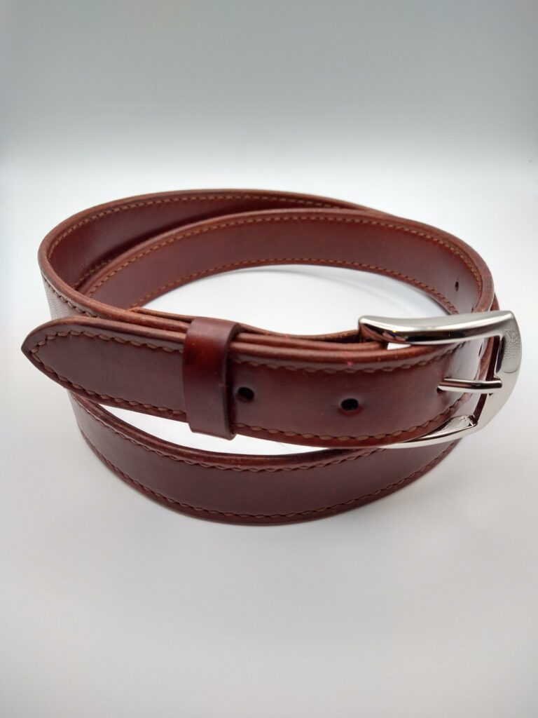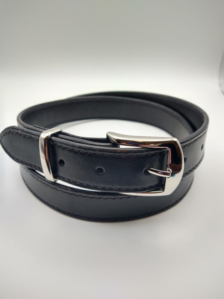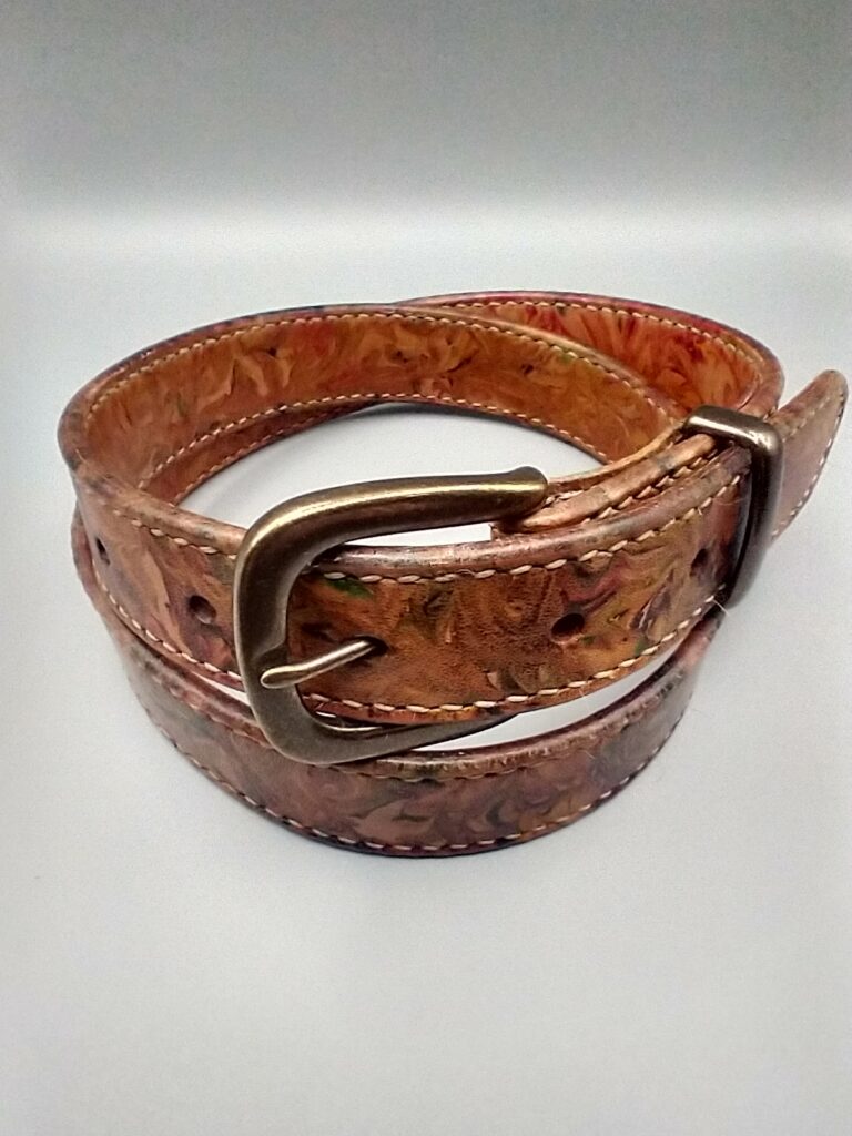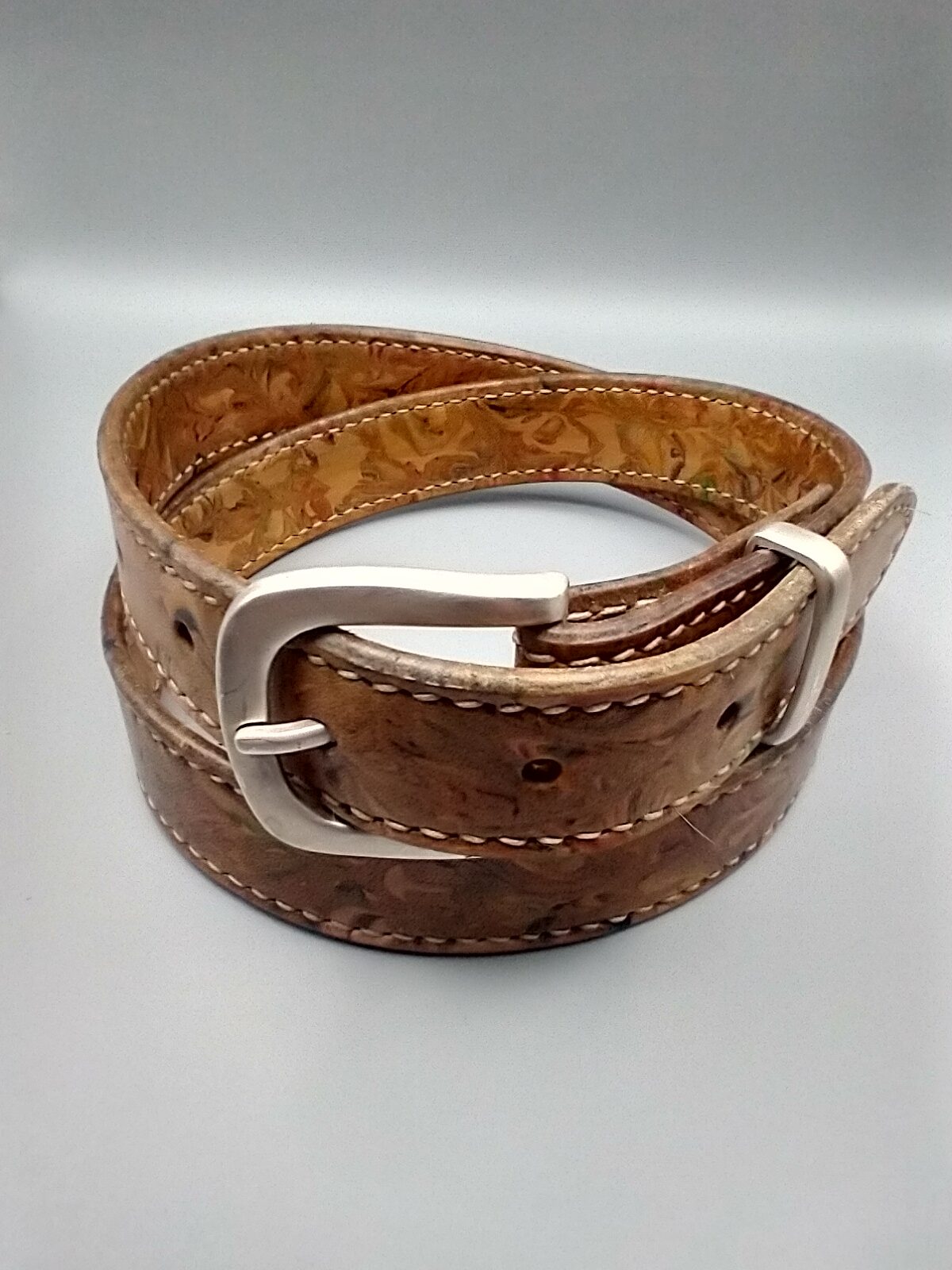 1 1/4″ marbled belt with beige stitching1 1/4″ marbled belt with brown stitching1 1/4″ brown belt with dark brown stitching1 1/4″ black formal belt with black stitching1 1/2″ black belt with turquoise stitching and a custom sterling silver buckle with turquoise inset1 1/4″ marbled belt with sterling silver buckle and keeper created by me.